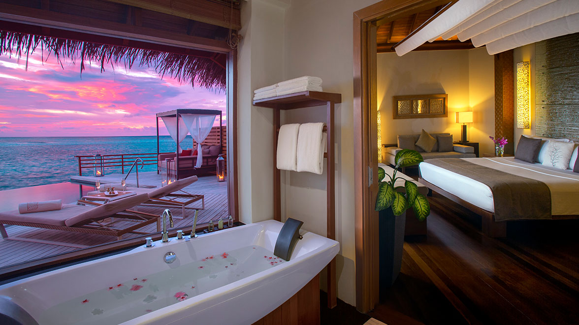The resort’s 75 spacious villas are crafted from timber and sandstone to blend with their natural surroundings. All are equipped with air conditioning, a flat screen TV with a selection of movies, surround sound system, iPod docking station, complimentary WiFi, mini bar and a private verandah or sundeck furnished with sun loungers and a sofa or day bed. Deluxe Villas are dotted along the shorefront and feature an open-air bathroom with outdoor rain shower, while the Water Villas have an indoor bathroom with stunning ocean views. We recommend upgrading to a Baros Pool Villa or Water Pool Villa to enjoy your own private plunge pool set into the sundeck. The exquisite Baros Suites, on the eastern shore of the island, are a haven of seclusion and offer additional space with a separate lounge, an expansive sundeck with thatched gazebo, a private infinity pool and direct beach access. The one-bedroom Baros Residence, hidden away within a walled garden, comes with a larger private pool, dedicated butler service, a spacious sundeck with four poster day bed and beach access.