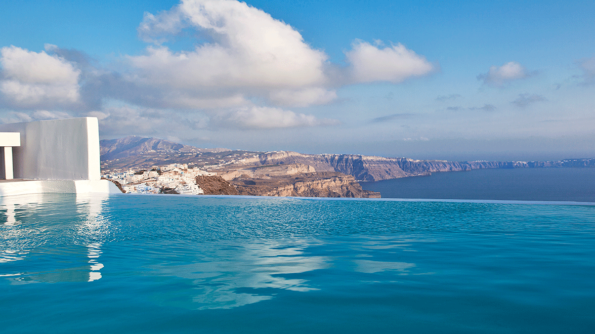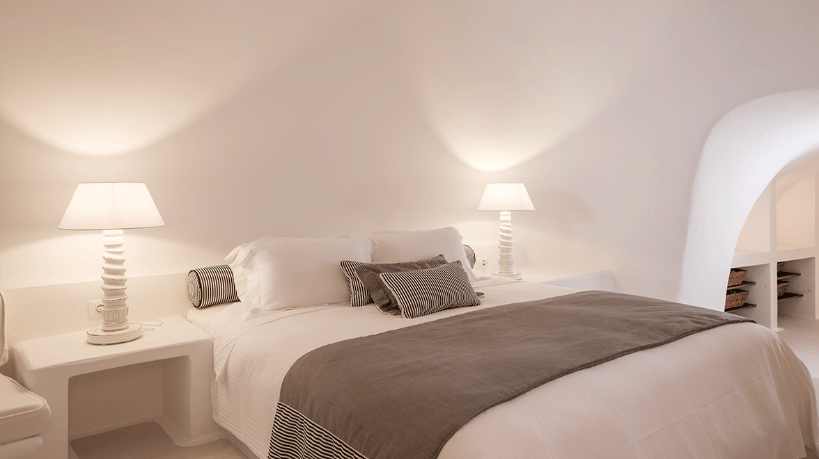 The chic suites of Katikies Chromata cascade down a cliffside at the apex of Santorini’s soaring caldera. This gorgeous boutique hotel is built into the rock and effortlessly compliments its stunning surroundings, where each room is uniquely shaped into the hillside.