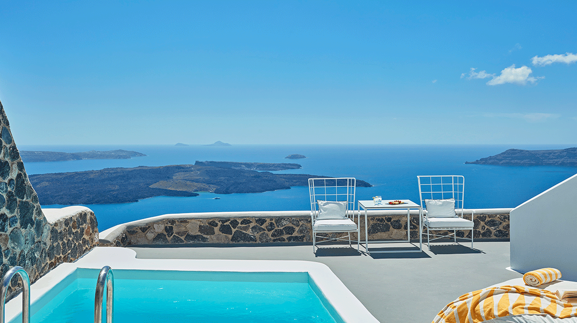 There are 25 rooms and suites plus a two-bedroom villa. All rooms have a private balcony with stupendous sea views, plus air conditioning, a satellite TV, iPod and dock, Nespresso machine, mini bar and complimentary WiFi. Some suites have an outdoor Jacuzzi, while the Master Pool Suite has a private plunge pool, and the Chromata Pool Suite has an infinity pool.
