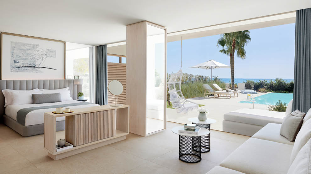 There are 411 contemporary rooms and suites, many with private gardens, balconies or pools. Ikos Deluxe Collection is for discerning guests – suites with jaw-dropping views and a range of exclusive services and private areas including reserved sections of the pool and beach, and a dedicated children’s pool.