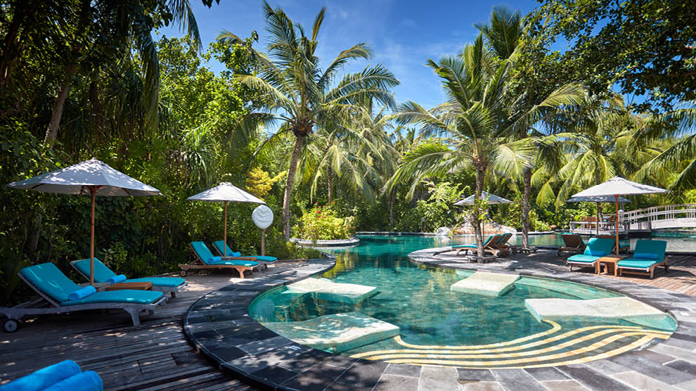 All 84 Beach Bungalows, Water Villas, One and Two Bedroom Suites and the Three Bedroom Royal Residence are furnished in natural tones with accents of turquoise, and each features a private pool. Beach Bungalows are a generous size with a light and airy bedroom combined with a comfortable indoor seating area. Step out to a furnished deck leading straight onto the beach and find your own shaded cabana. Bathrooms are partially open with double vanities, shower and bath, and open to a private courtyard with outdoor shower, plunge pool and sun loungers. Water Villas can be sunrise or sunset view and include an indoor bathroom and outdoor sundeck with infinity plunge pool looking out over the ocean. One Bedroom Beach Suites offer additional space and include a separate living room, rain shower, Jacuzzi bath and private plunge pool, while for larger families the Two Bedroom Grand Water Suite, Royal Island Suite and Three Bedroom Royal Residence are ideal.