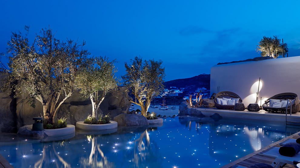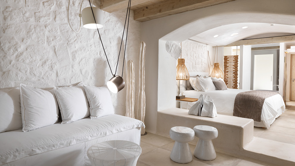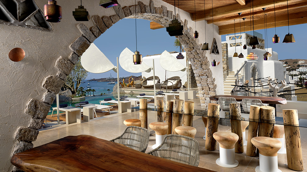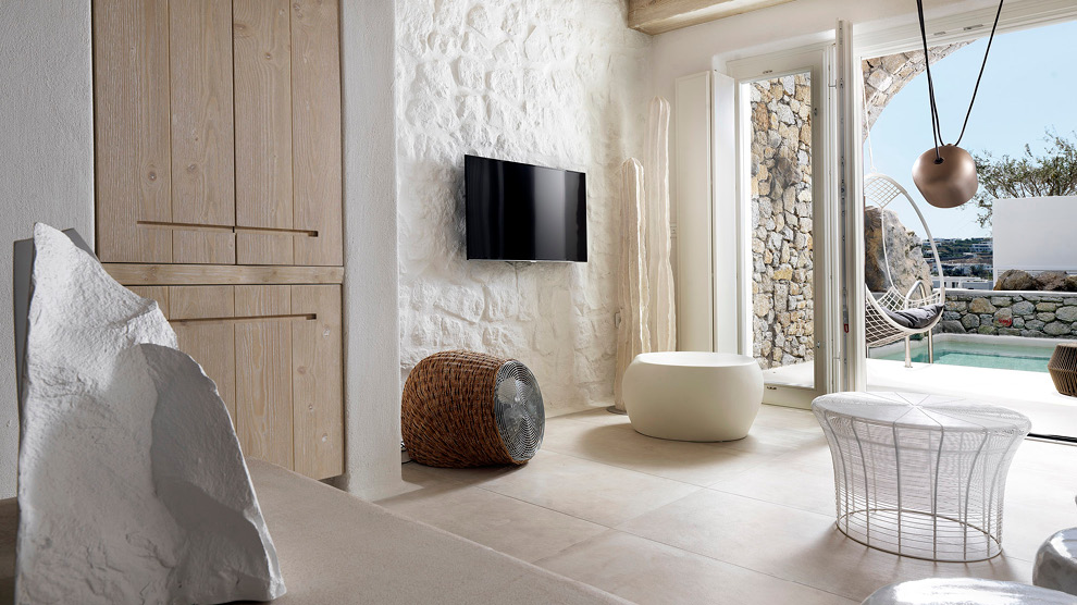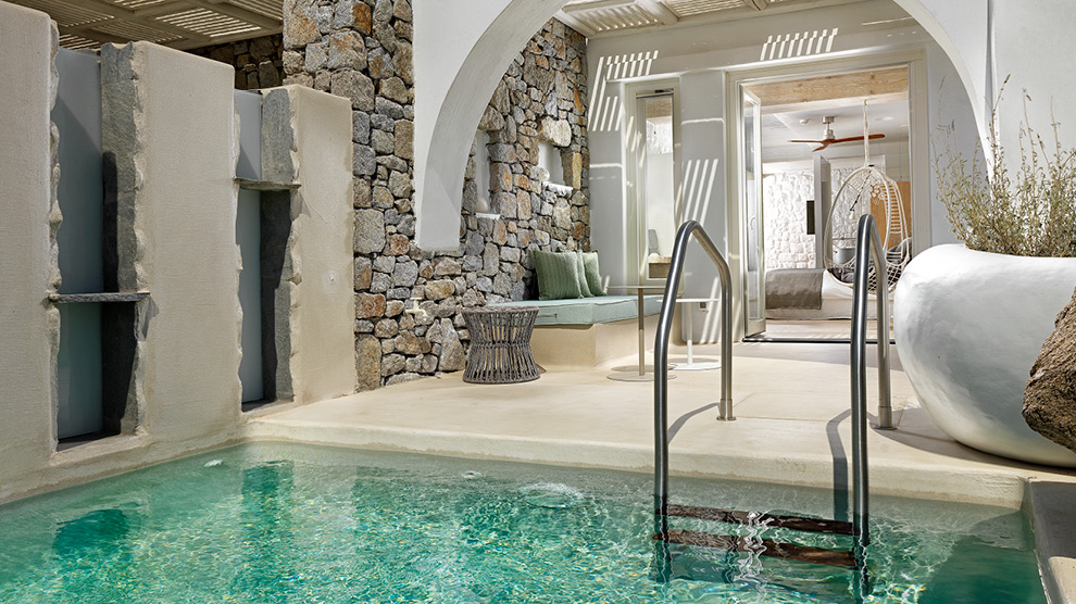 There are 35 uniquely-designed rooms and suites, most of which have their own plunge pool or hot tub, and all of which feature an LCD-LED TV with over 100 satellite channels, fully-stocked mini bar, iPad, luxury bathroom amenities by Hermès, a Nespresso coffee machine, luxurious 100% cotton linens, and complimentary WiFi. Many rooms feature private Jacuzzis or plunge pools along with sensational views of the bay of Ornos. The brand new six-bedroom Kenshõ Private Luxury Villa is an extravagant option for those wishing to enjoy the services of the hotel, yet ensconce themselves in a more private atmosphere with unobstructed views of Ornos bay from a spacious private terrace and infinity pool. Extra amenities include a fully-stocked wine fridge and mini bar, an outdoor fully-equipped kitchen, 24-hour concierge, and complimentary transfers to and from the wider resort and airport. A private chef, butler service, island transportation, beauty treatments, catered events, tailor-made excursions and dining experiences are also available on request.