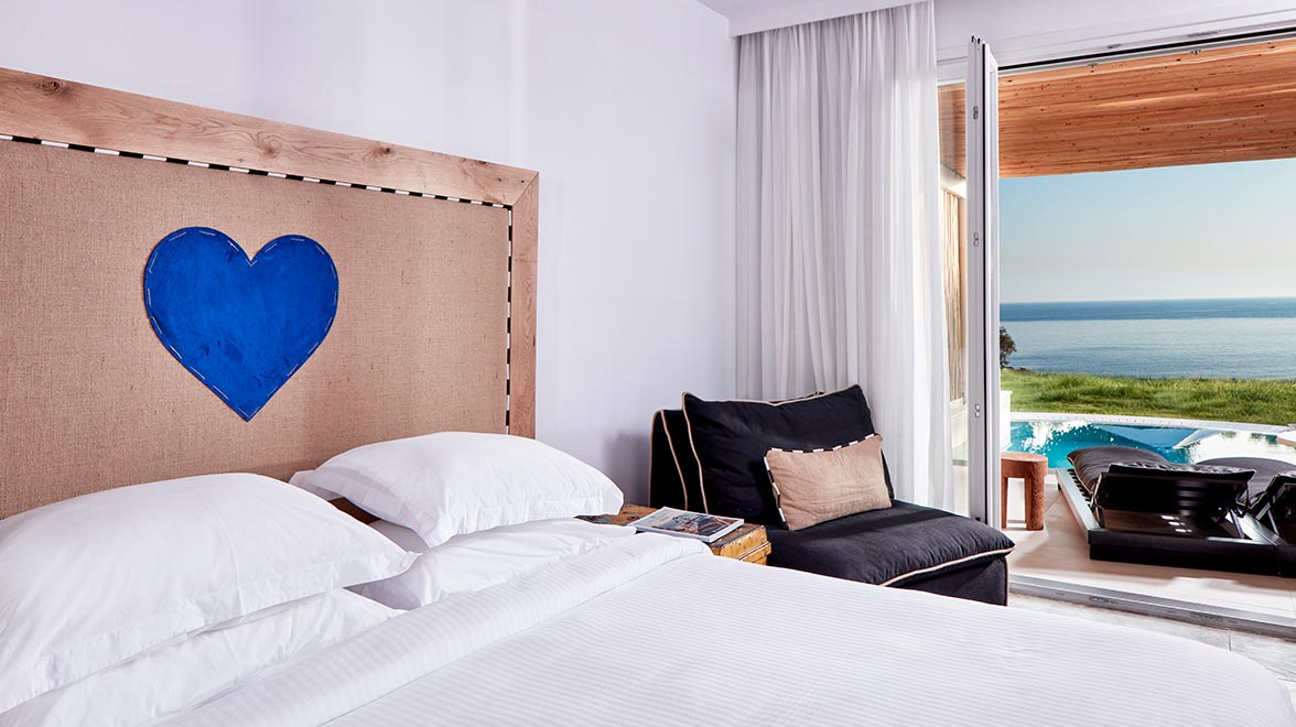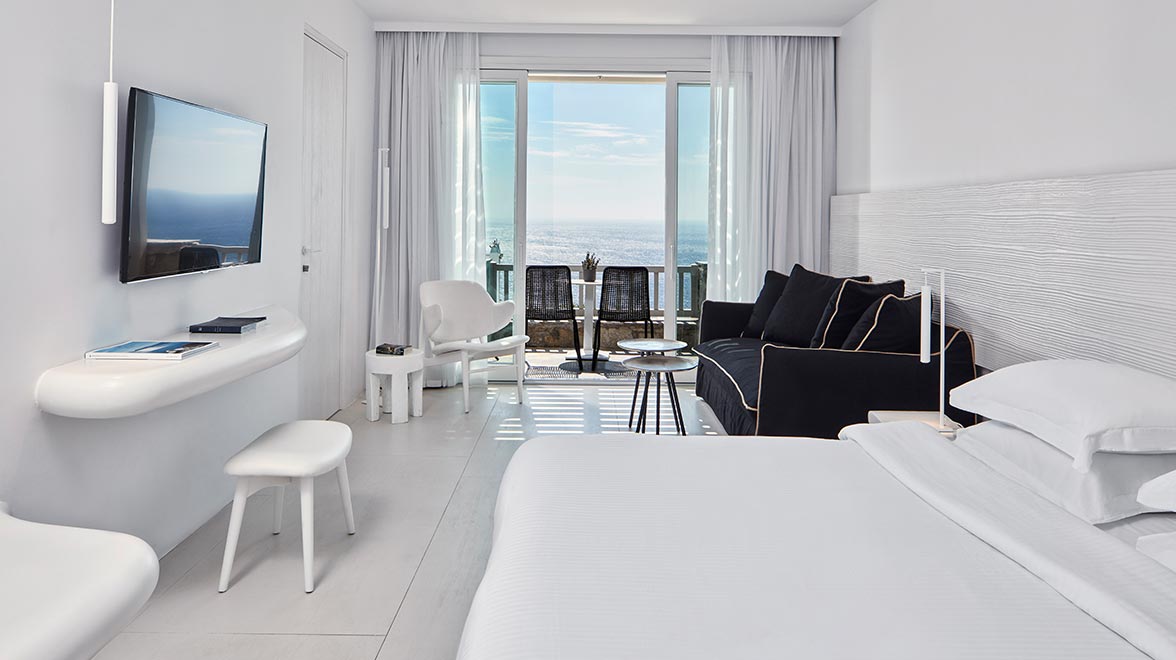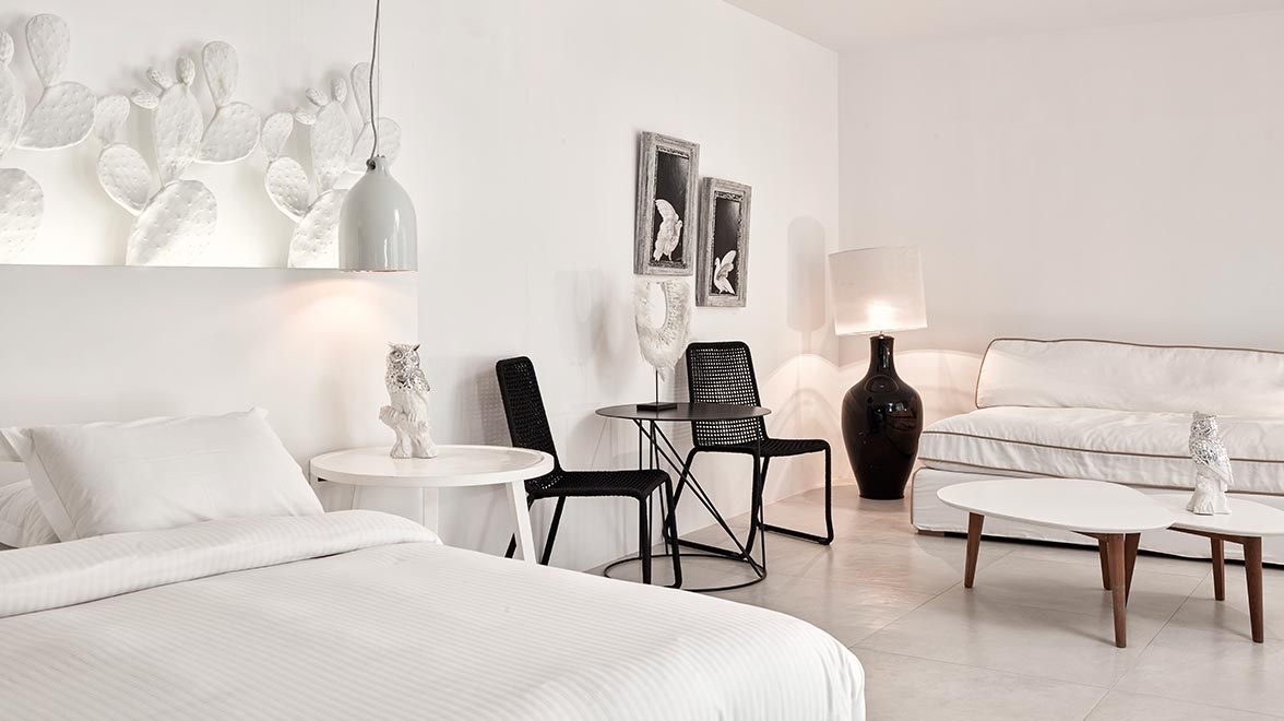 The 111 rooms and suites showcase a bold, contemporary design, the all-white colour palette enlivened with quirky design touches like heart and lightning bolt motifs above the bed. All rooms have a private balcony or terrace, flat-screen TV and WiFi, and some have a private outdoor Jacuzzi or private pool. The Executive and Grand Executive Suites are particularly spacious, with a large furnished terrace, private pool and splendid sea views.