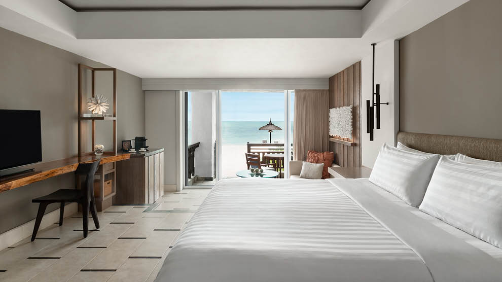 The 200 rooms and suites all have ocean views, either looking out over Coral or Hibiscus beach, or situated on Frangipani island, an islet linked to the main resort by a small bridge. All accommodation offers a balcony or terrace, air conditioning, satellite TV, complimentary WiFi, mini bar, and a king or two queen size beds. Coral Deluxe Rooms are a great value option for couples or small families, while Hibiscus Junior Suites offer more space and are set back from the resort’s largest beach, with the option to upgrade for direct beach access. Frangipani Club Junior Suites and One Bedroom Suites are ideal for couples or honeymooners with a more private location on Frangipani island and upgraded bathrooms, including a stunning central egg-shaped bath, double vanities and a rain shower; the One Bedroom Suites also feature a separate lounge/dining area. The exclusive ShangriLa One Bedroom Suite, located in the Hibiscus wing, offers the ultimate in luxury and service with an expansive master bedroom, large living/dining room and an oversized terrace with stunning views. For larger families, the secluded three-bedroom Beach Villas each include 24-hour butler service, a private infinity pool, garden with outdoor waterfall shower and direct beach access.